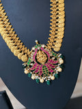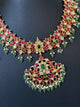 Silver Look-alike Pachi Kundan Jadau Kasu Necklace. Base metal is alloy. Pendant is very grand and is one of a kind. All stones and pearls used are of high quality. High quality polish and looks exactly like pure silver jewelry. Length of necklace min 20” and comes with extension chain.