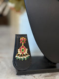 Silver Look-alike Pachi Kundan Jadau Necklace with earrings. Base metal is alloy. Pendant is very grand and is one of a kind. All stones and pearls used are of high quality. High quality polish and looks exactly like pure silver jewelry. Length of necklace min 14” and comes with extension dori. Earrings approx 2.25” long