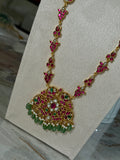 Silver Look-alike Pachi Kundan Jadau Necklace. Base metal is alloy. Pendant is very grand and is one of a kind. All stones and pearls used are of high quality. High quality polish and looks exactly like pure silver jewelry. Length of necklace min 18” and comes with extension dori.