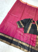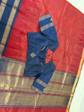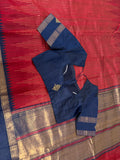 Red and Blue Pure Jute Pattu Saree with stitched Blouse. Blouse comes with Tanjore painting on back and sleeves. Blouse size is 40 and can be extended.