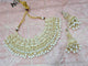 kundan necklace set with earrings and mang tika embellished with pearls. Necklace fits to neck and comes with adjustable dori. Earrings measure approximately 3.5"