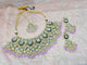 kundan necklace set with earrings and mang tika embellished with pearls. Necklace fits to neck and comes with adjustable dori. Earrings measure approximately 4"