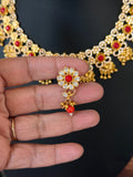 Pure 925 Silver with 24 Carat Gold Polish CZ and Coral Necklace with matching earrings. Necklace fits to neck with dori and can be adjusted. Earrings are appropriate 1.5” long.