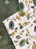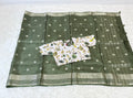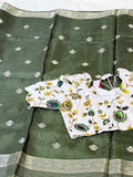 Vintae Inspired Premium Banaras Crepe Saree in Mehandi Green Color and with stitchedKalamkari Silk Blouse with embroidery. Blouse size is 38 and can be extended.
